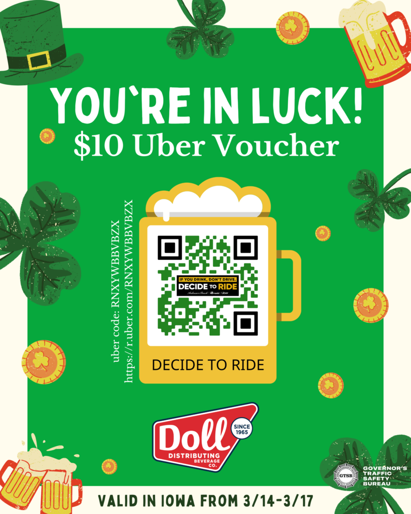 To help Iowans plan ahead and stay safe, Doll Distributing is offering a $10 Uber voucher through their Decide to Ride program. GTSB supports this program by raising awareness and sharing resources for sober rides. The voucher will be active March 14-17, 2026, in the state of Iowa, and will be capped at 1,000 redemptions.